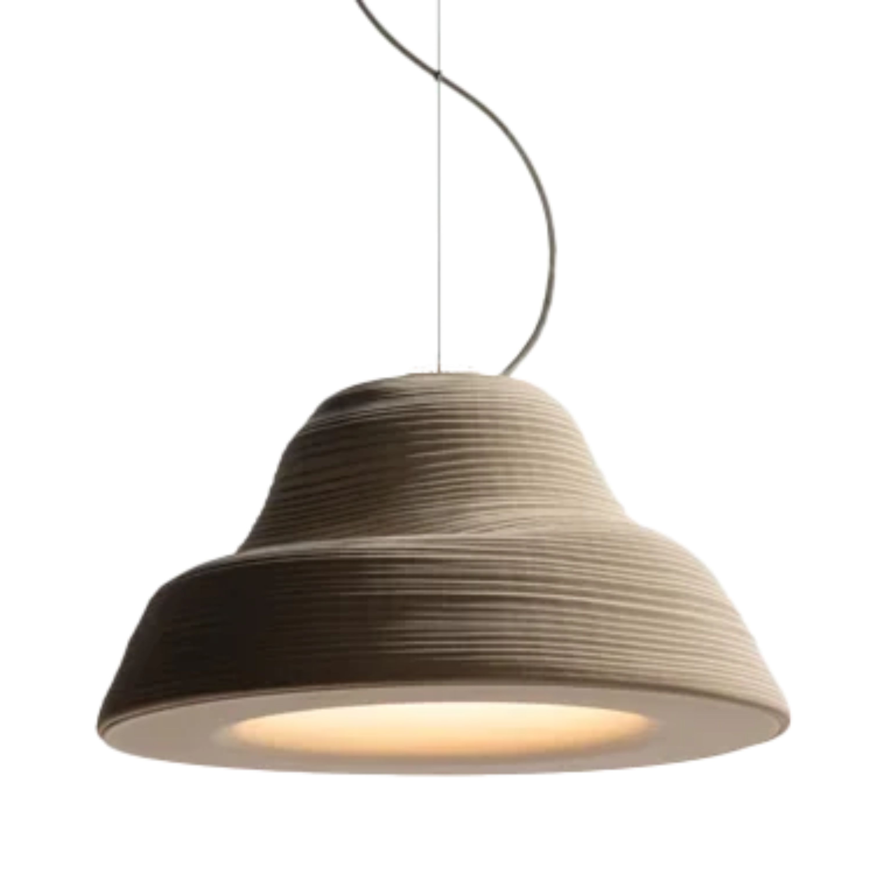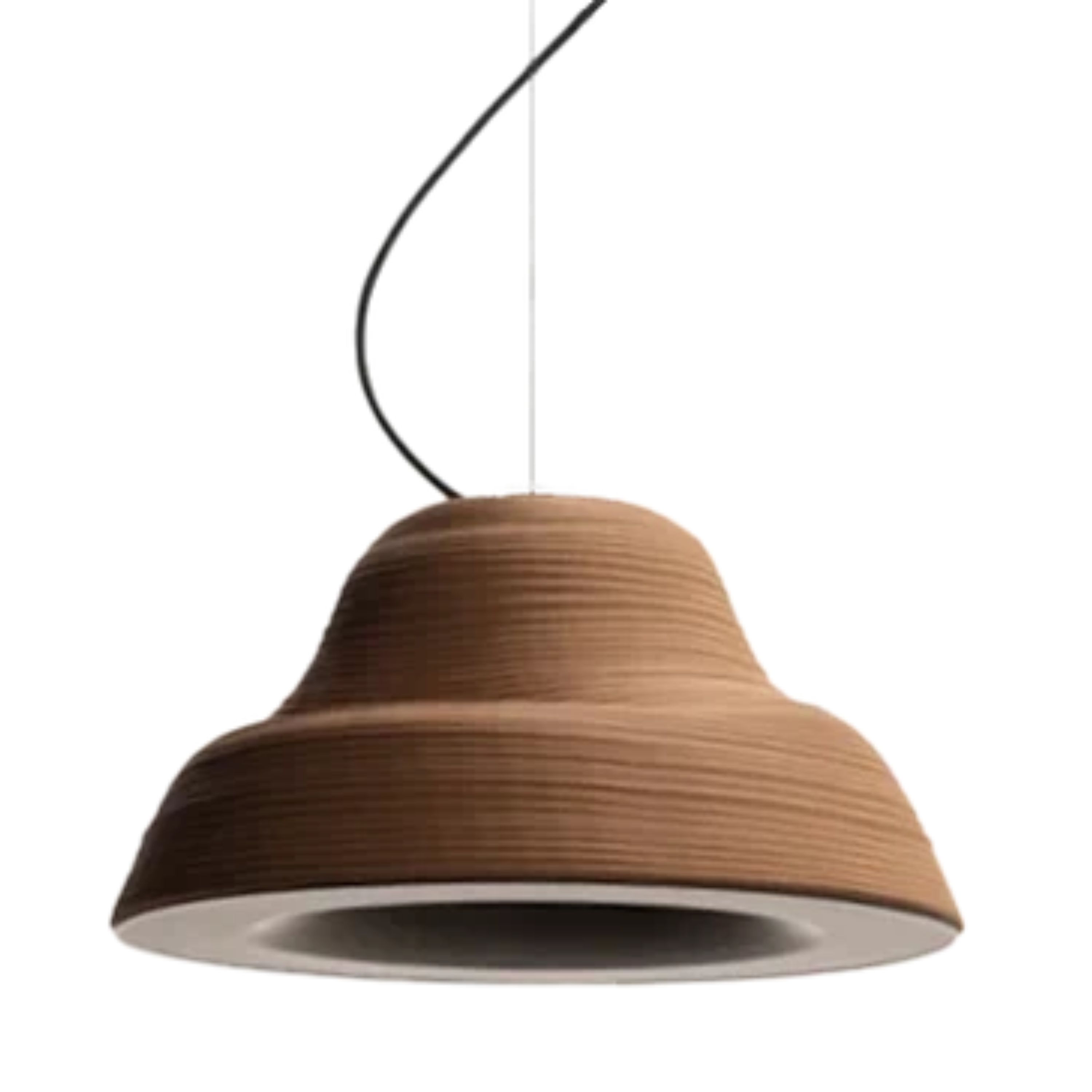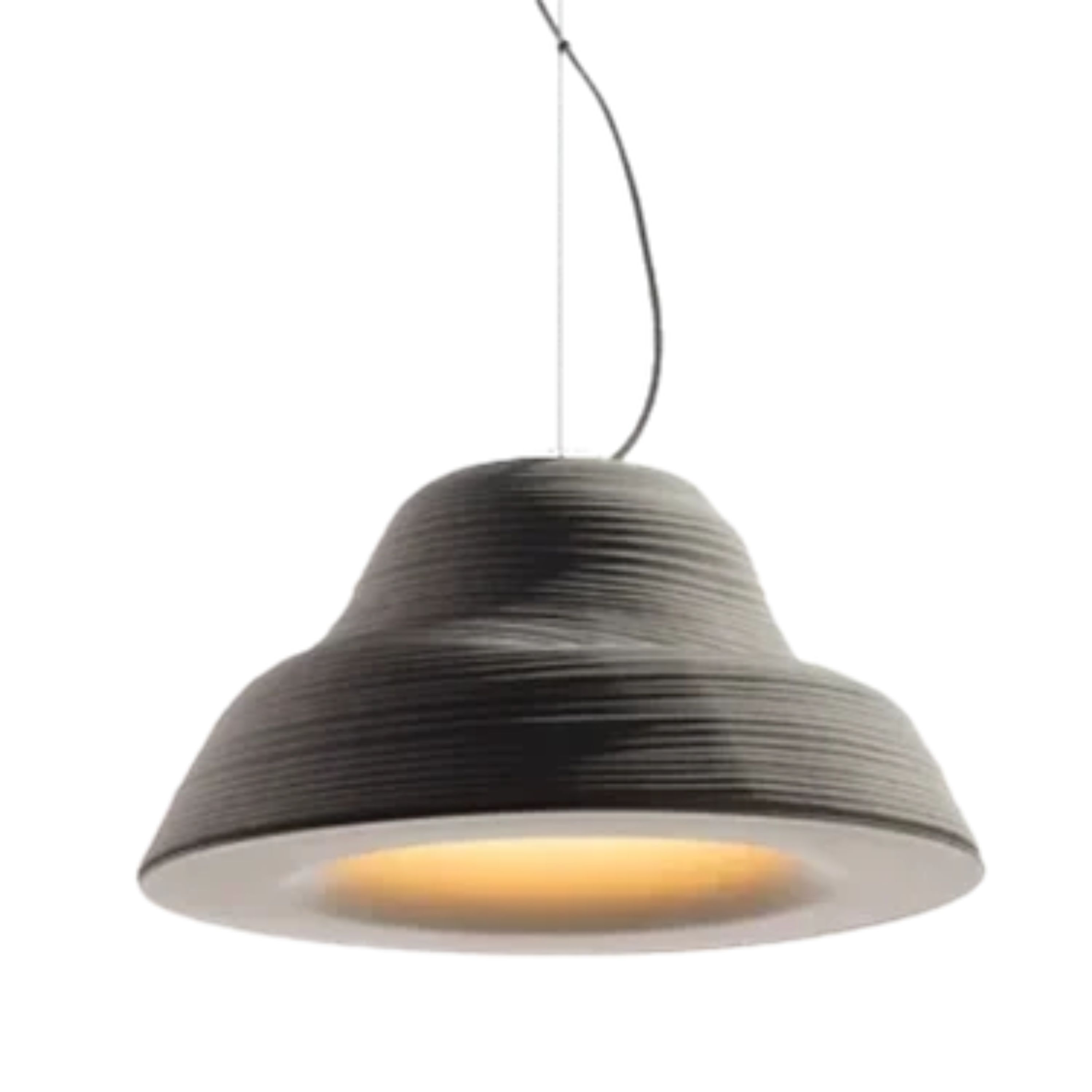 Lámpara de suspensión de luz semi directa. Cuerpo en cerámica y aluminio. Tensores de acero galvanizado y cable blanco o negro.