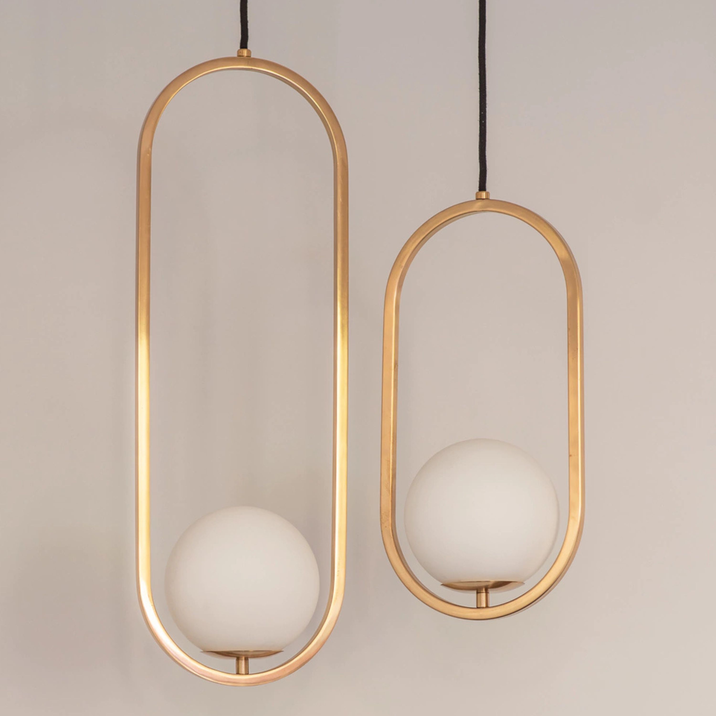 Lámpara colgante de estructura metálica y bocha de vidrio opal. Incluye 100cm de cable textil y florón. Consultar por barral adicional a tono. Zócalo G9. No incluye foco de luz.