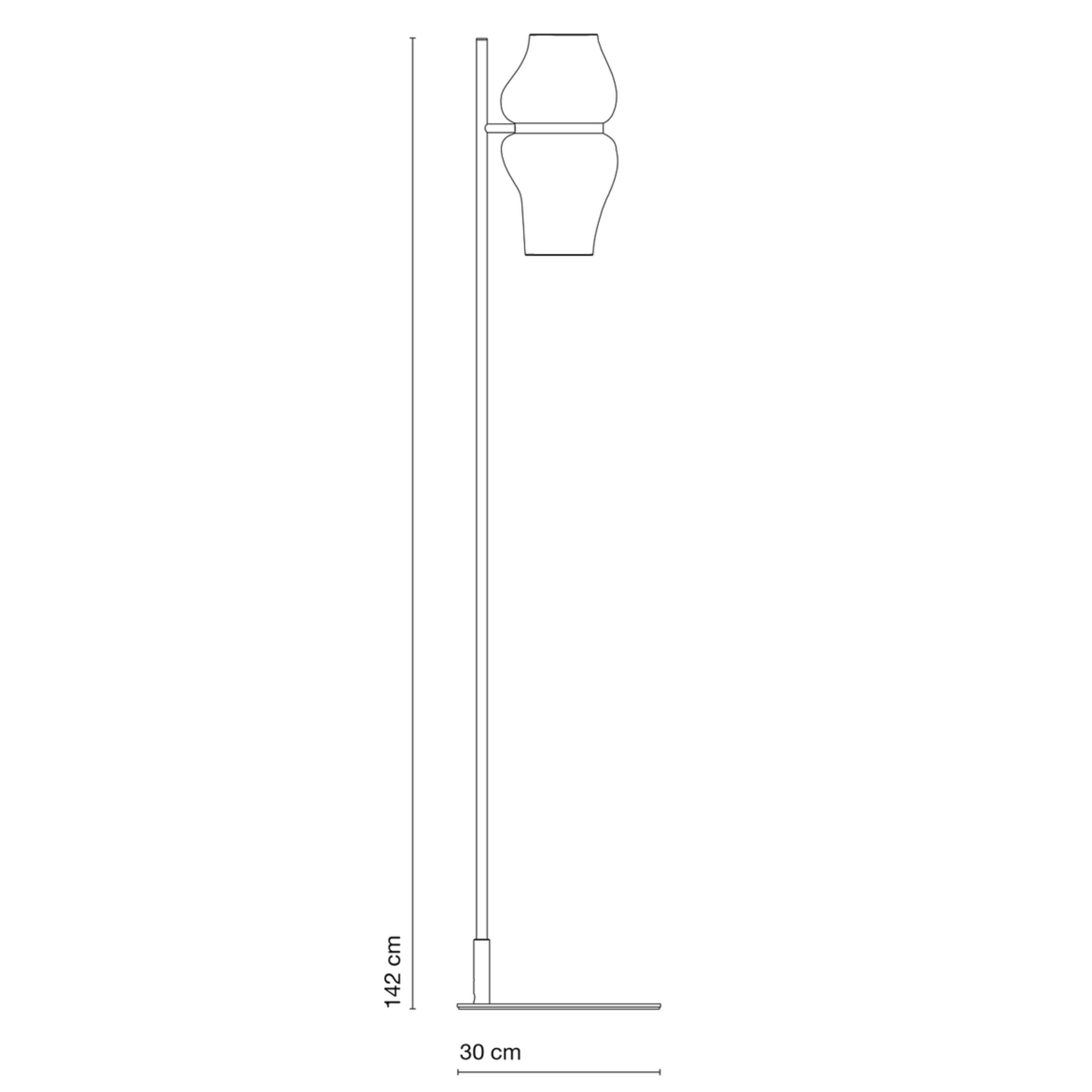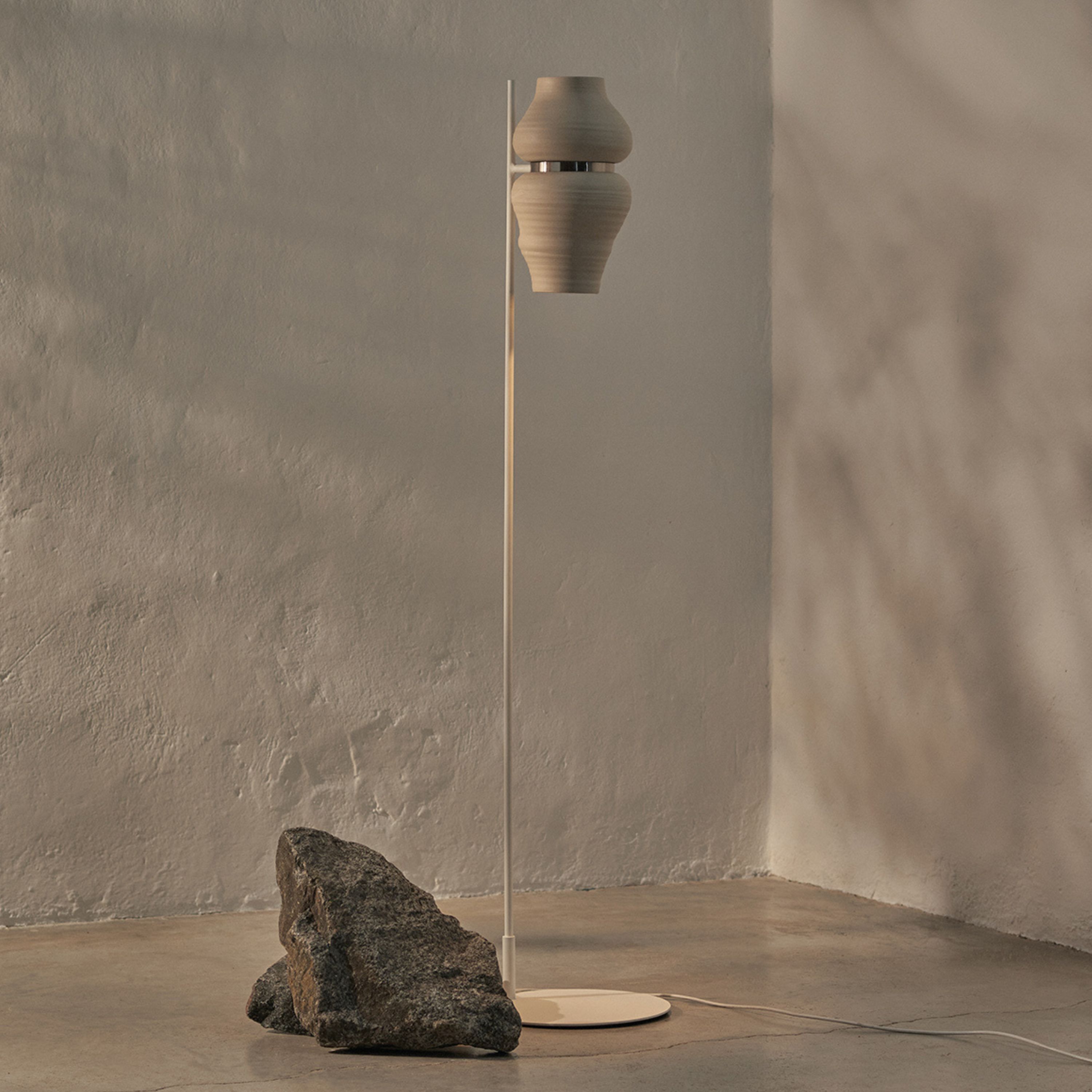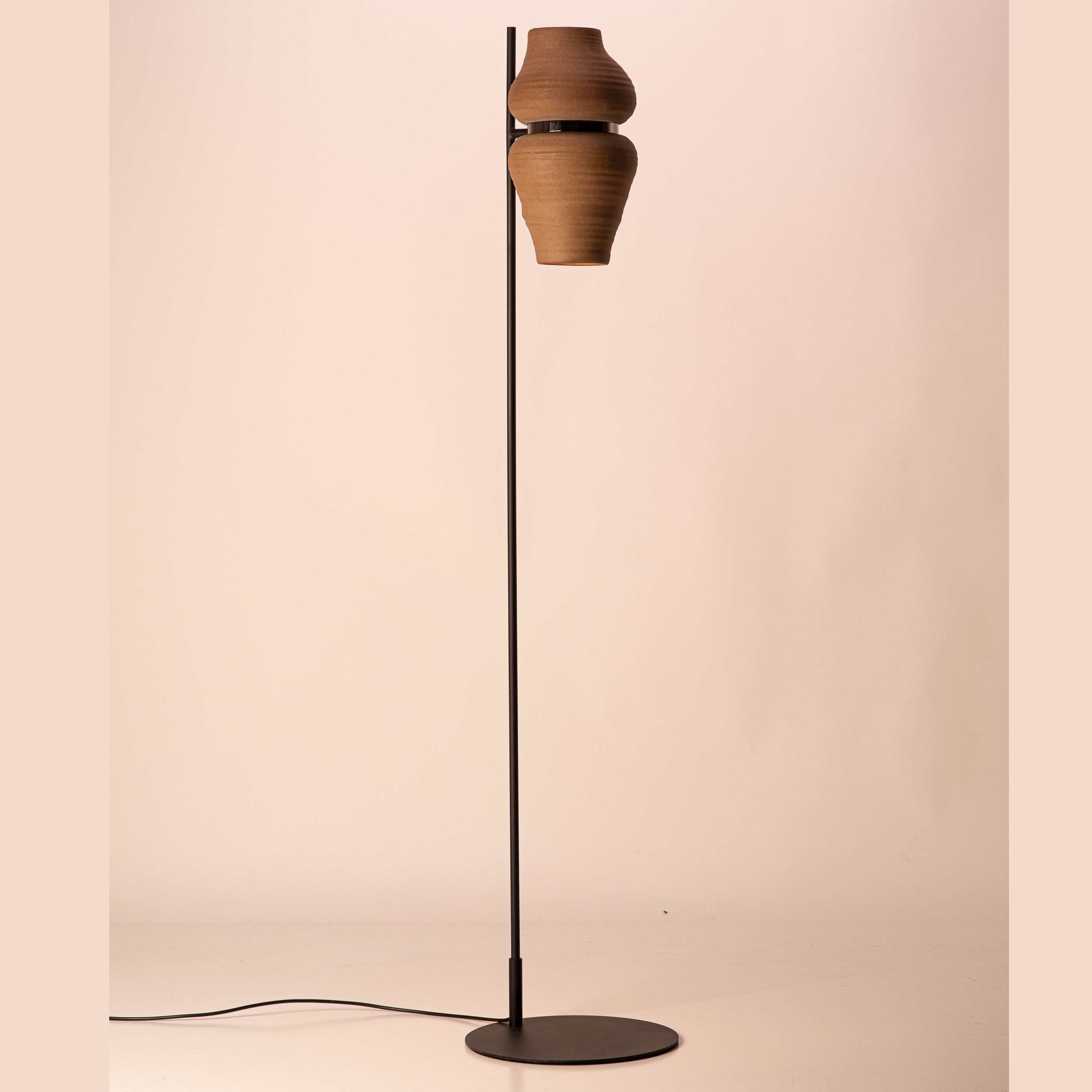 Lámpara de pie de luz directa bidireccional. Cuerpo en cerámica hecho a mano y aro metálico. Base y pie de acero blanco o negro. Cable blanco o negro con interruptor on/off.