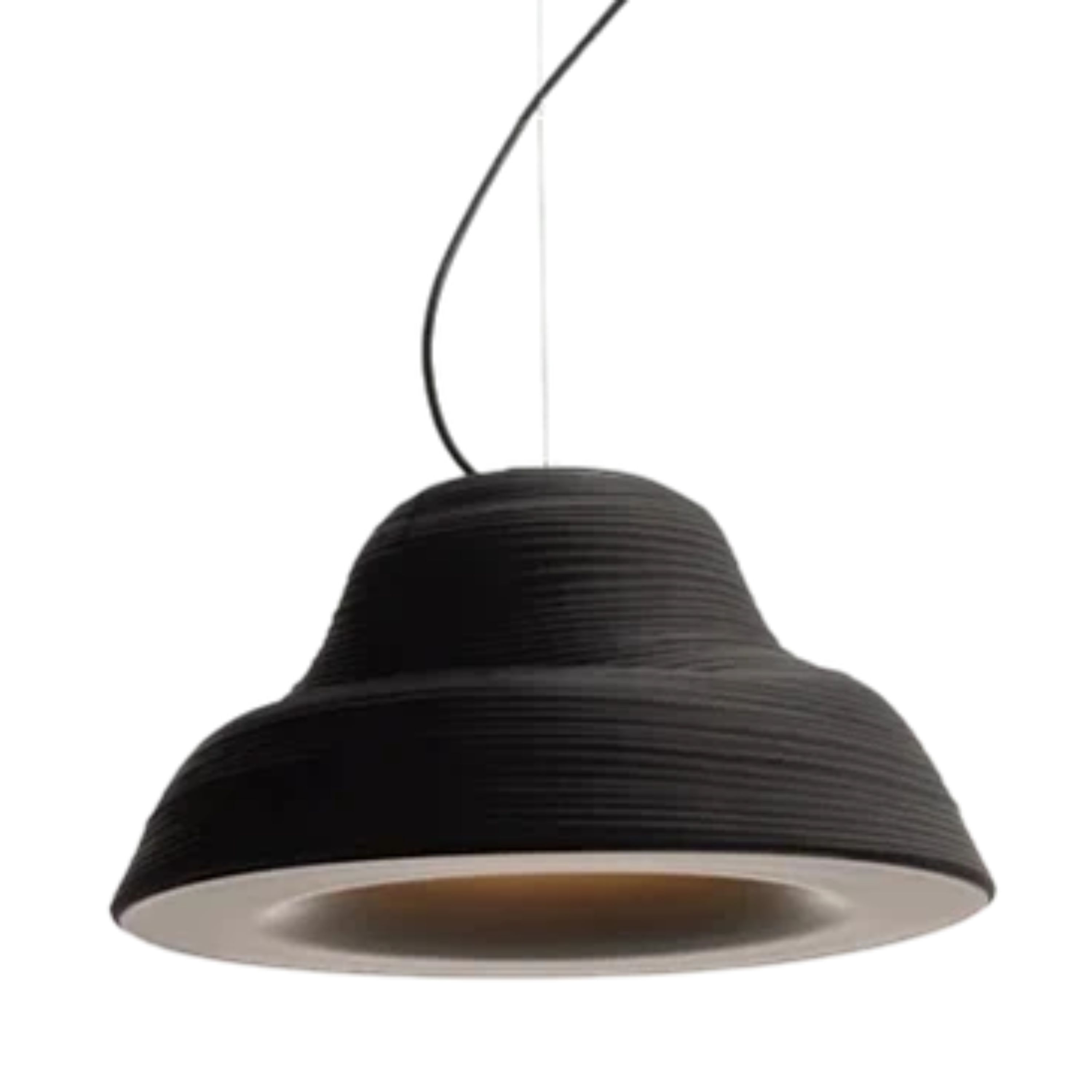 Lámpara de suspensión de luz semi directa. Cuerpo en cerámica y aluminio. Tensores de acero galvanizado y cable blanco o negro.