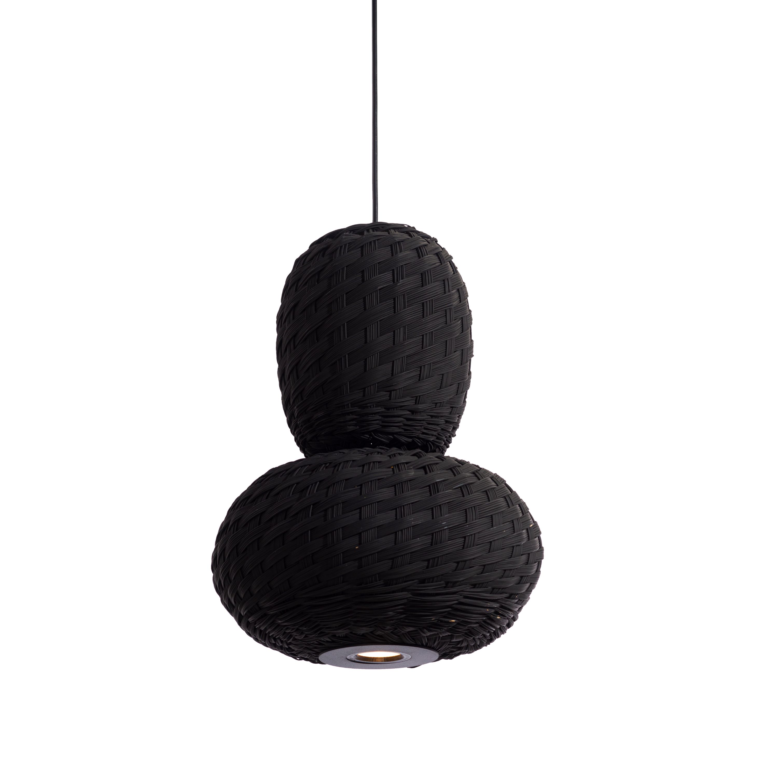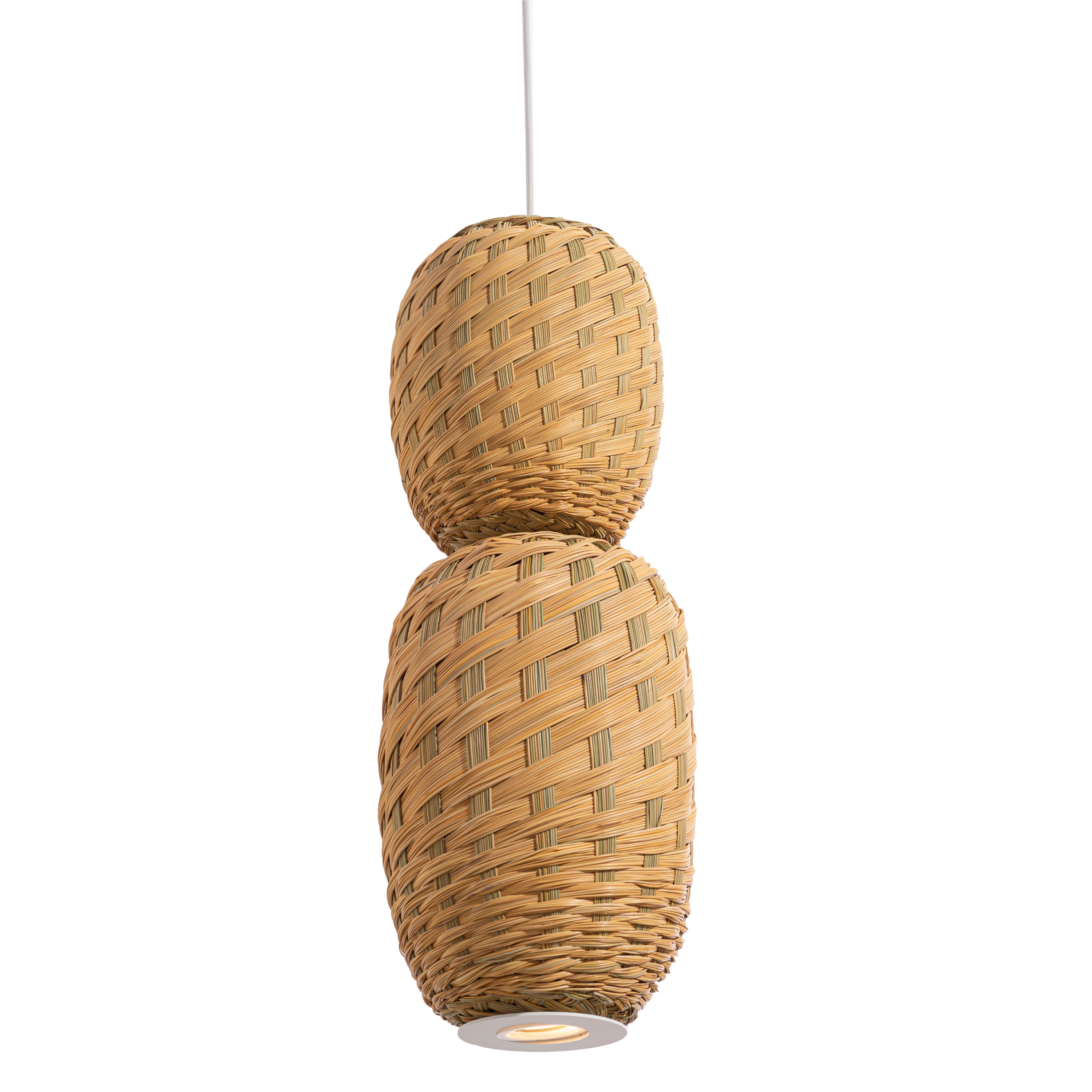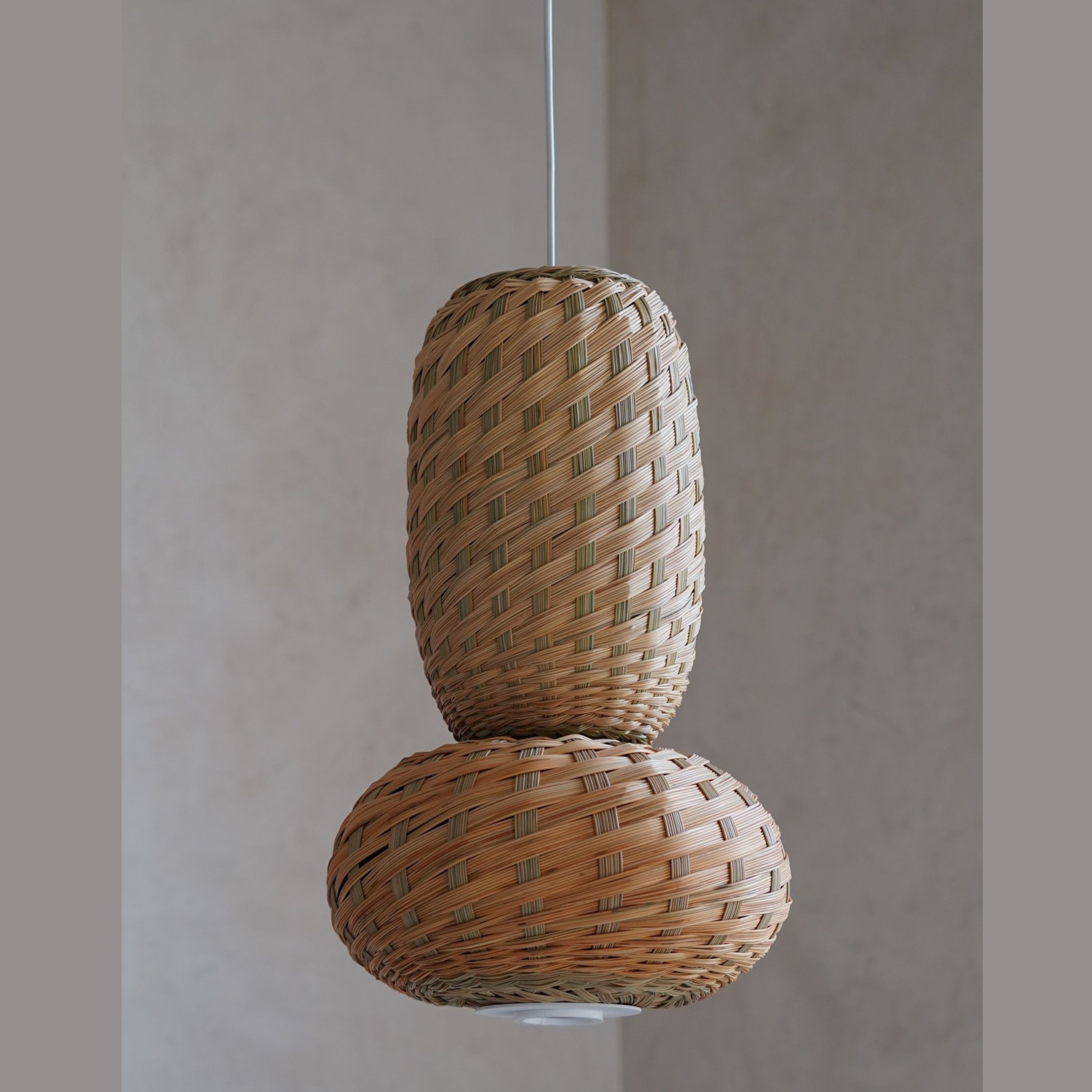 Lámpara de suspensión de luz semi directa. Cuerpo en tejido de fibra natural "simbol" hecho a mano y disco de aluminio. Tensores de acero galvanizado y cable blanco o negro.
