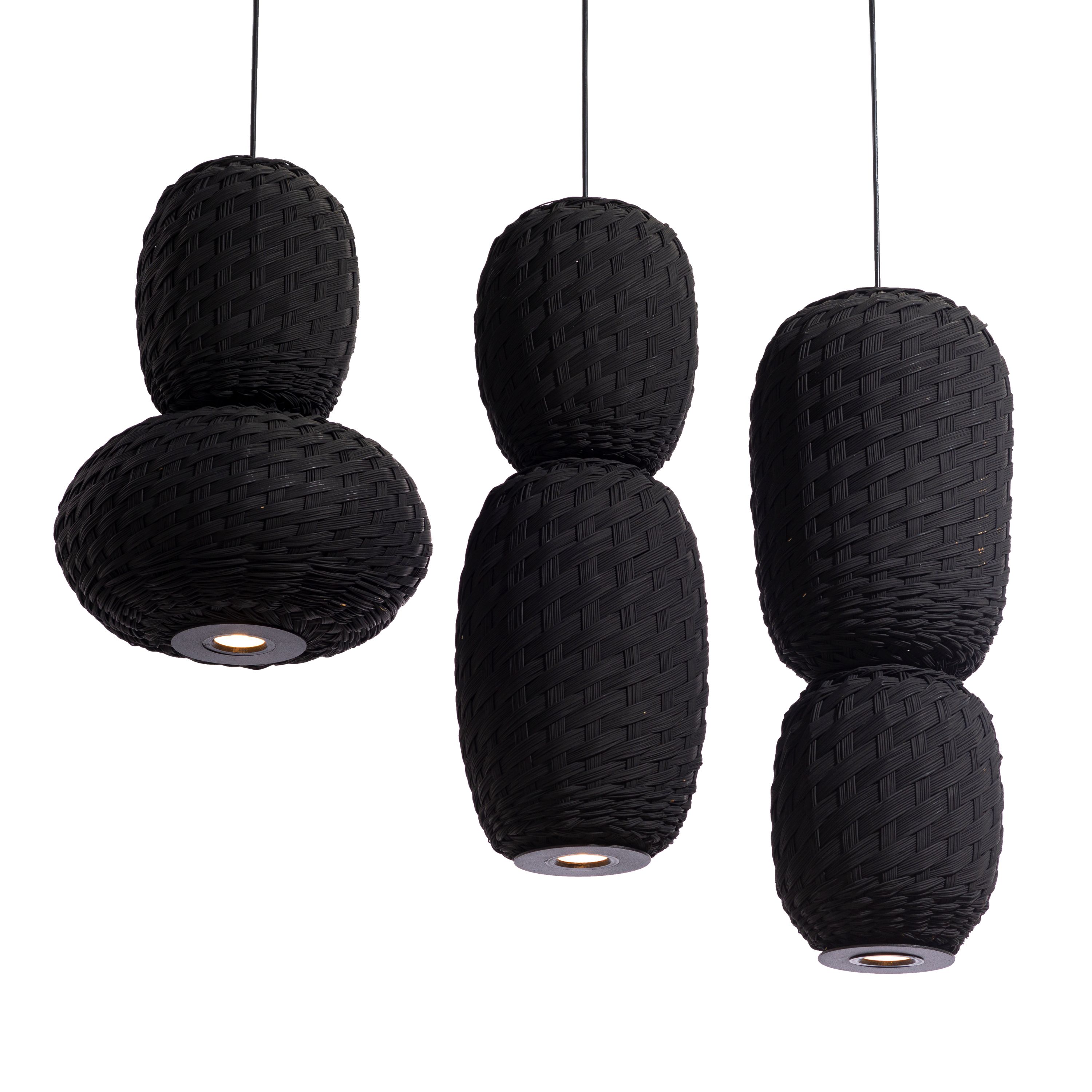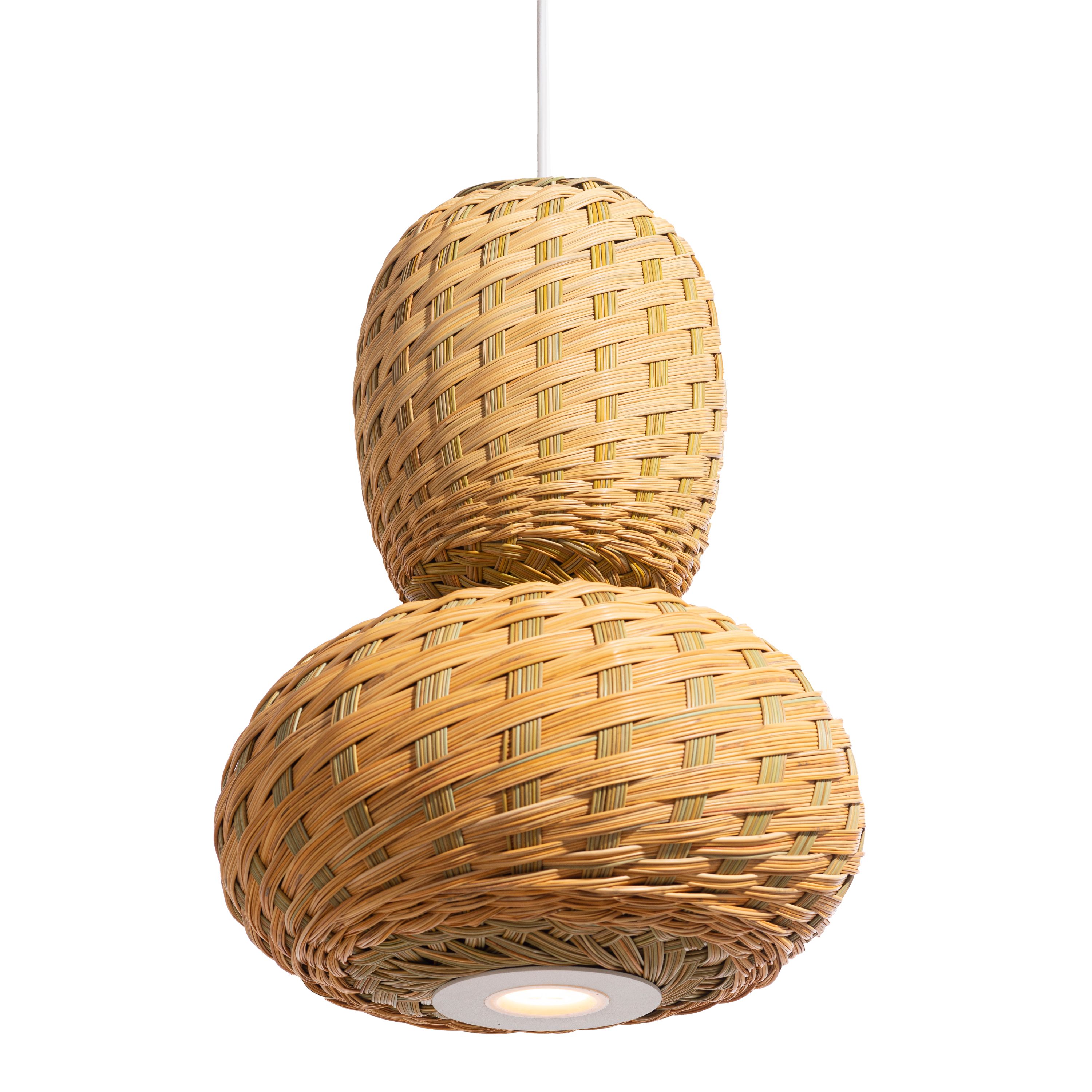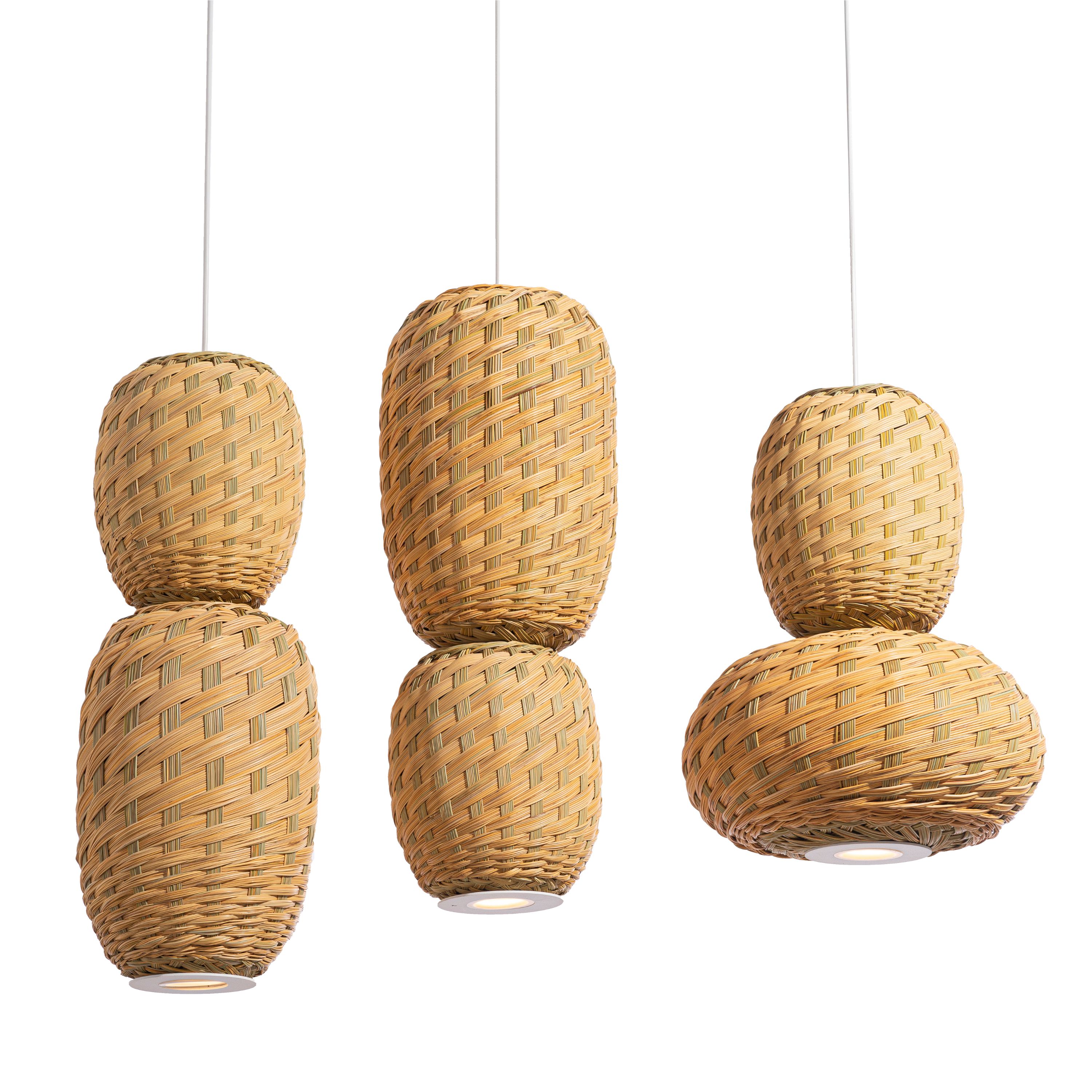 Lámpara de suspensión de luz semi directa. Cuerpo en tejido de fibra natural "simbol" hecho a mano y disco de aluminio. Tensores de acero galvanizado y cable blanco o negro.